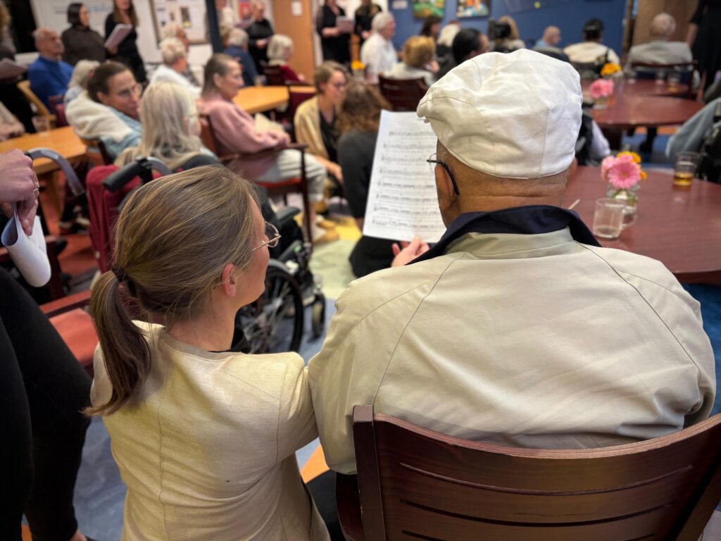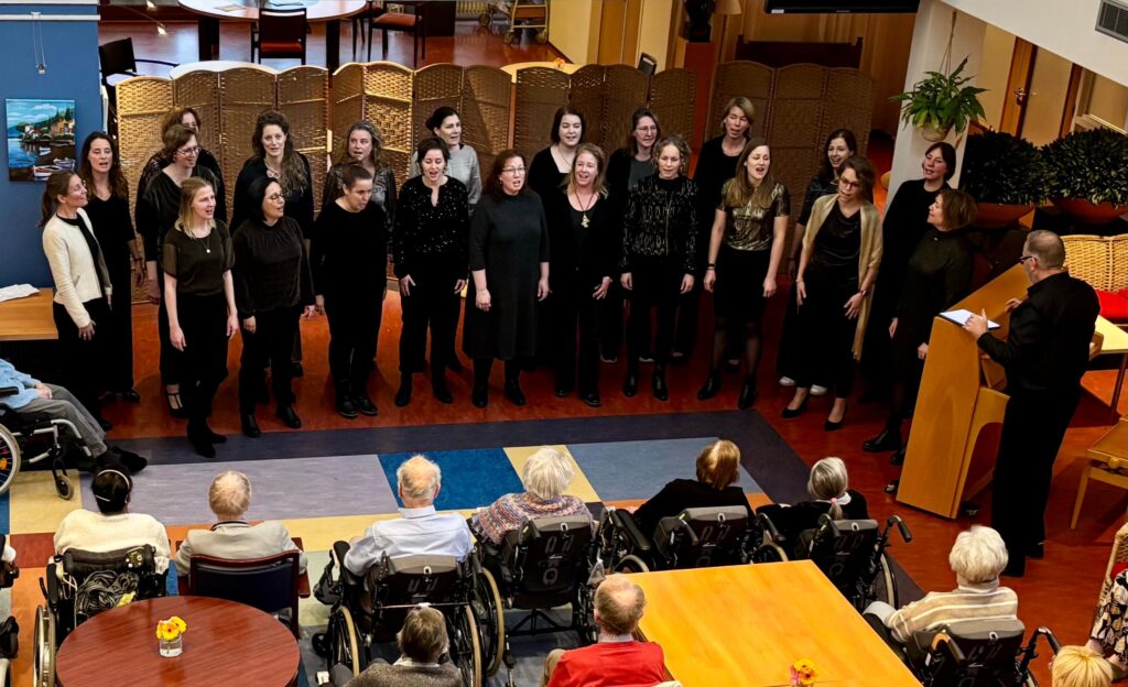 Natuurlijk hadden we ons ook voorbereid op bekende oud-Hollandse meezingers. We verspreidden ons door het restaurant en zochten de bewoners op. Samen met hen zongen wij over een stekkie van de fuchsia, Margrietje, een roosje voor mijn roosje en tulpen uit Amsterdam. Net zoals wij tijdens onze wekelijkse repetities ervaren, zagen we ook hier hoe zingen mensen verbindt. De bewoners en wij hebben genoten.